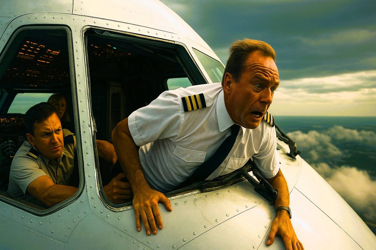В кабине идет борьба за контроль. В салоне — за самообладание. Между ними — выбитое стекло, за которым на высоте 5 километров безжизненно висит тело капитана. Это лишь начало.