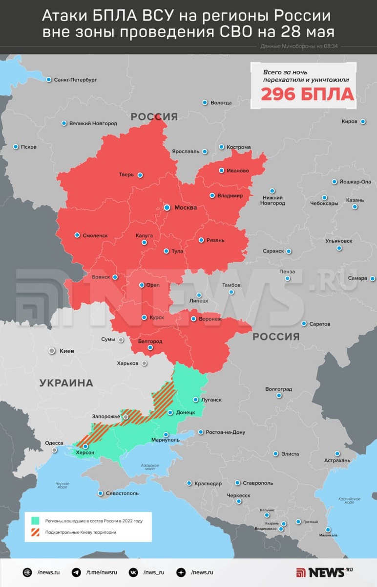Российская ПВО уничтожила за ночь 296 украинских беспилотников, сообщили в Минобороны РФ. БПЛА сбили над Московским регионом, Брянской, Белгородской, Владимирской, Воронежской, Ивановской, Калужской, Курской, Орловской, Рязанской, Смоленской, Тверской и Тульской областями. ⭕ Подписаться | Прислать новость | Буст