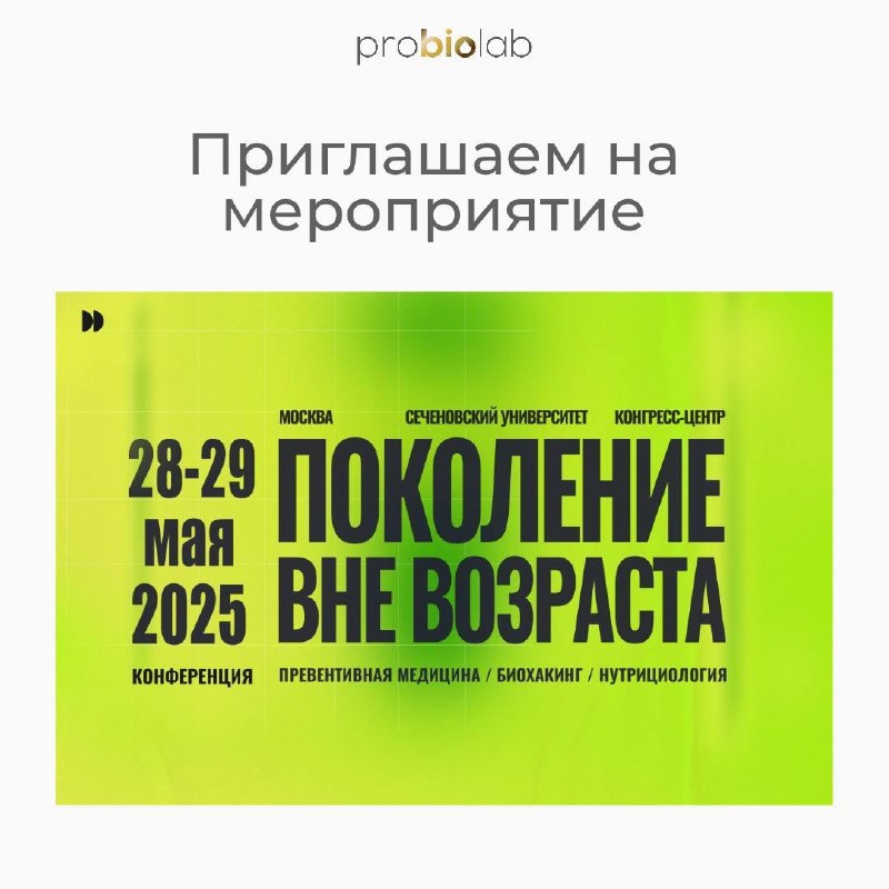 Приглашаем Вас посетить одну из самых масштабных конференций в сфере превентивной медицины, биохакинга и нутрициологии «Поколение вне возраста»! 📌На нашем стенде у Вас будет возможность получить консультацию и приобрести биодобавки по специальной цене. 📌И много полезной информации в рамках конференции нового формата, где эксперты обсудят ключевые вызовы и инновации в сфере: ▶️Ментального и физического здоровья ▶️Генетики, микробиома и фармакогеномики ▶️Антивозрастной косметологии и эстетики ▶️Саркопении, гормонального баланса и стрессоустойчивости ▶️Персонализированной фармакопрофилактики и биомаркеров старения ▶️Антиэйдж-стоматологии и медицины сна Конференция «ПОКОЛЕНИЕ ВНЕ ВОЗРАСТА» соберет ведущих экспертов в области медицины и здравоохранения. 28 – 29 мая 2025 📍Москва, Конгресс-центр Сеченовского университета Адрес: Москва, ул. Трубецкая, 8 #здоровье #probiolab
