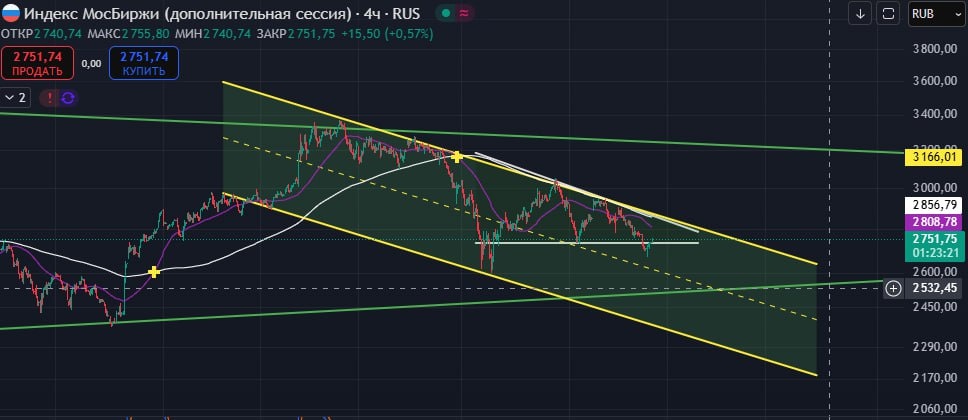 $IRUS Цена всё также находится в большом треугольнике. ➡️В данный момент корректируется после большого падения с 2900 до 2692. 🕯Идём в канале на понижение. Верхняя стенка канала 2870, но по технике вряд ли мы туда пойдём, скорее всего дойти можем до 2778, оттуда уже оттолкнёмся и поедем дальше вниз. 🔽Движение до 2500 продолжается, естественно, рынок не может идти без откатов, поэтому строится канал. ✔️Цель графика напомню 2520. НЕ ИИР #теханализ #индекс