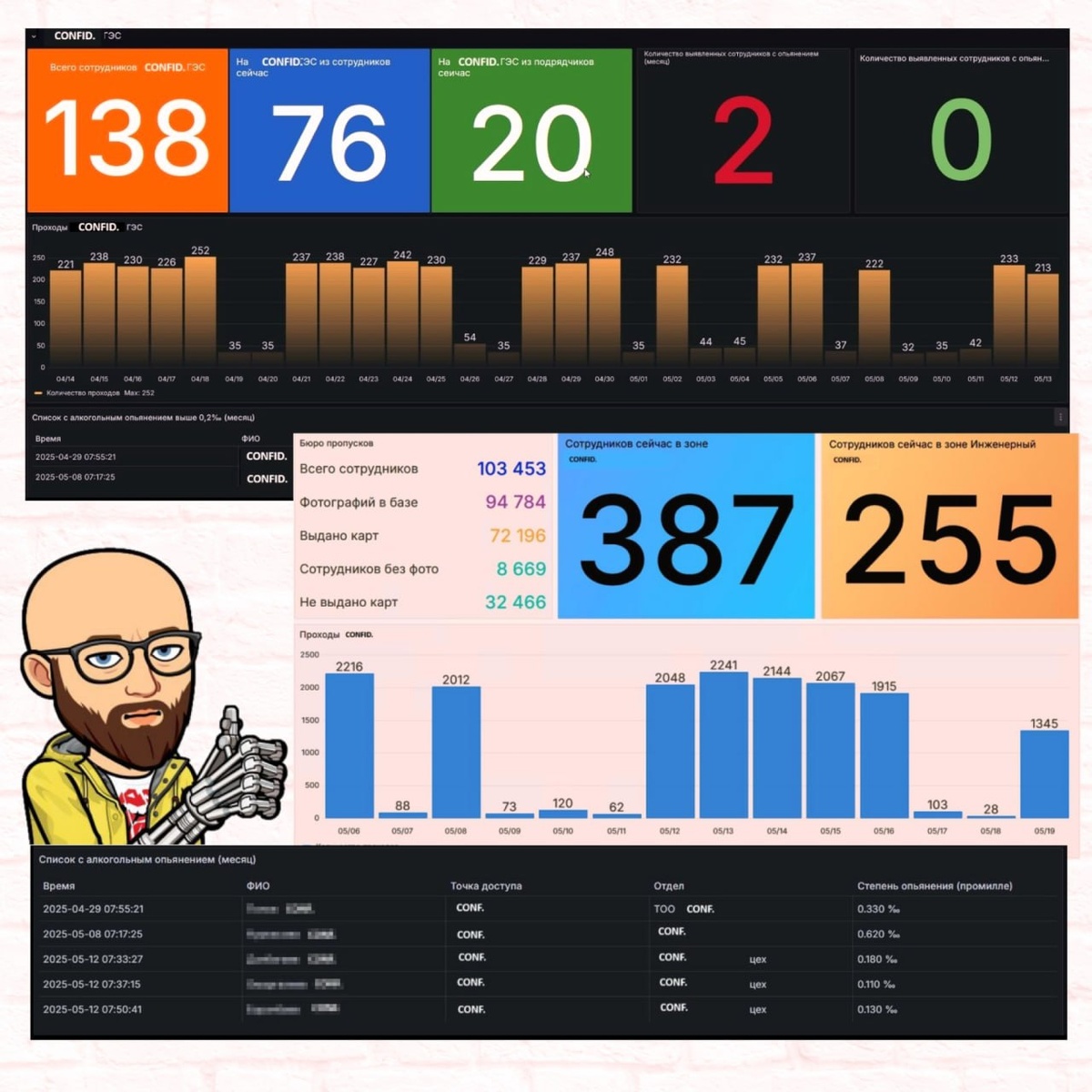 Так... так... так! Евгений (@jon_grek) продолжает выдавать огнище! Он из Artorius-corp (если вы вдруг забыли) - представительства SIGUR в Казахстане (сидит тут, рядышком) И вот вам немного его практики из его мира СКУД, который не только про «открыть дверь». 📊 На одном из объектов (энергетического комплекса) Женя сделал дашборды в Grafana, в которые свел данные из SIGUR — всё в реальном времени. Например: — кто на территории и в каких зонах — количество подрядчиков на территории и постоянных сотрудников — случаи алкогольного опьянения (да, с промилле) — проходы через КПП — кто не имеет фото или карты доступа — сколько сотрудников надо накормить в столовой 🎯 Дашборд построен на Grafana. Получение информации происходит путем запроса к реляционной базе данных (по умолчанию MariaDB, но можно использовать PostgreSQL/PostgresPRO). Выводится на любой смарт-ТВ. Никаких клиентов, нужен только браузер. 🚨 Безопасники, охрана труда и начальники смен видят всю картину сразу, не погружаясь в