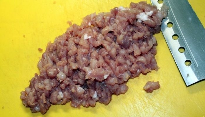Мясо вручную рубят ножом. Чтобы облегчить нарезку, рекомендуется предварительно подморозить куски. Для этого нужно нарезать свинину и говядину крупными пластами и отправить в морозильную камеру на 20 минут.