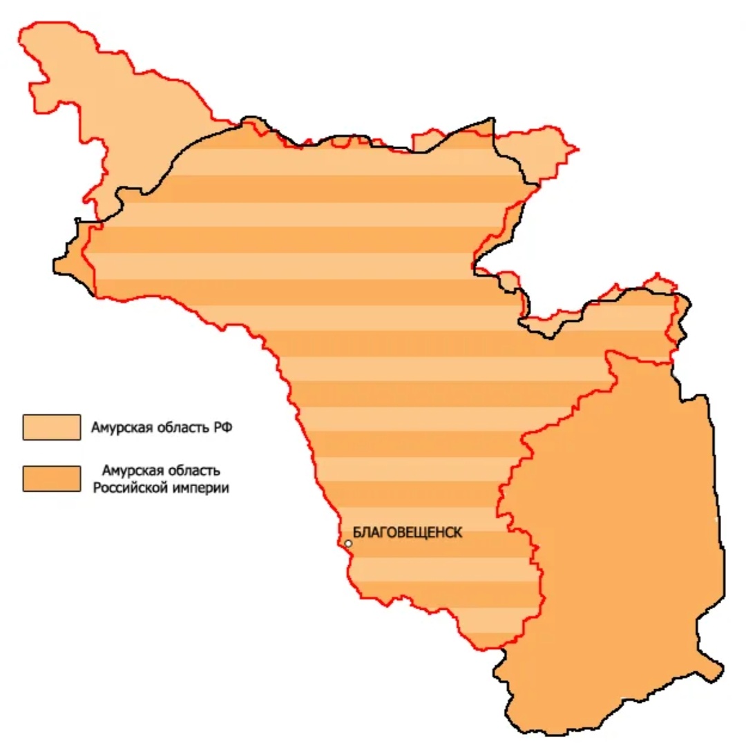 - Амурская область учреждена 8 (20) декабря 1858 года в границах: на юге и юго-западе — по Амуру; на западе — от слияния Шилки и Аргуни; на северо-востоке по водоразделу бассейнов Амура и Лены до Станового хребта по нему, Джугдыру, Джагдыи Ям-Алиню до верховьев Буреи, от них по прямой до Амура в месте впадения в него Уссури. Территория области в этих границах составляла 449 535 км².