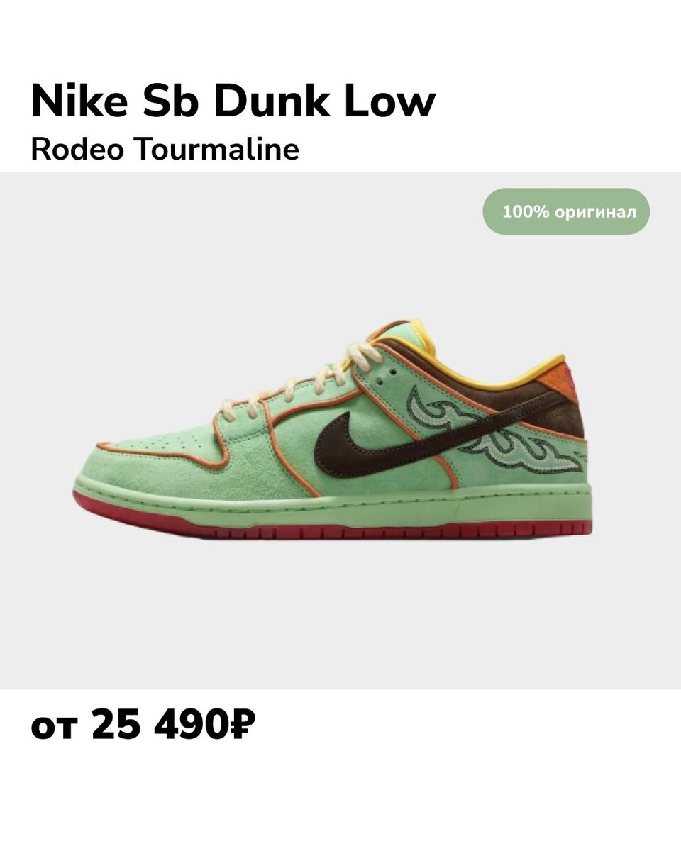 Nike Sb Dunk Low Rodeo Tourmaline - это особая лимитированная модель, выпущенная в мае этого года в честь Black History Month. 🎨Цветовая гамма: основной цвет — насыщенный зелёный турмалин, дополненный коричневыми (Baroque Brown) и оранжевыми (Monarch) акцентами. Чёрный замшевый Swoosh и красная полупрозрачная подошва придают контраст и завершённость образу. Материалы: верх выполнен из замши и кожи, с декоративной строчкой, напоминающей ковбойские сапоги. Канаты-стильные шнурки и потрескавшиеся кожаные вставки на пятке подчёркивают винтажный характер. Детали: внутренняя стелька украшена иллюстрацией заката в пустыне с надписью: “What’s gonna happen is gonna happen”. Под язычком скрыто послание: “Certified for the Real Riders, Crafted for the Modern Cowboy”. Заказать пару: ссылка К менеджеру: http://t.me/shnurokshipping_bot