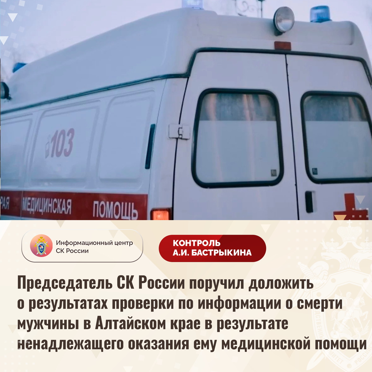 Председатель СК России поручил доложить о результатах проверки по информации о смерти мужчины в Алтайском крае