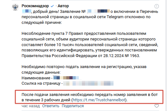 После подачи заявления необходимо передать номер заявления в бот в течение 3 рабочих дней (https://t.me/Trustchannelbot).