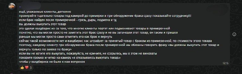А это уже новость для покупателей WB. Проверяйте, пожалуйста, очень внимательно товар перед получением (перед примеркой) на камеру. После примерки в случае обнаружения брака такой "брак" ляжет на вас. Вывод: теперь придется тщательнее заказывать товары, но цена на товар станет дешевле (за счёт уменьшения доли логистики в цене). Ну и ждем кучу возвратов для селлеров, т.к. теперь будут искать любой "брак" у товаров, даже тот которого нет. Обуви и одежде с низкими чеками особенно будет весело)