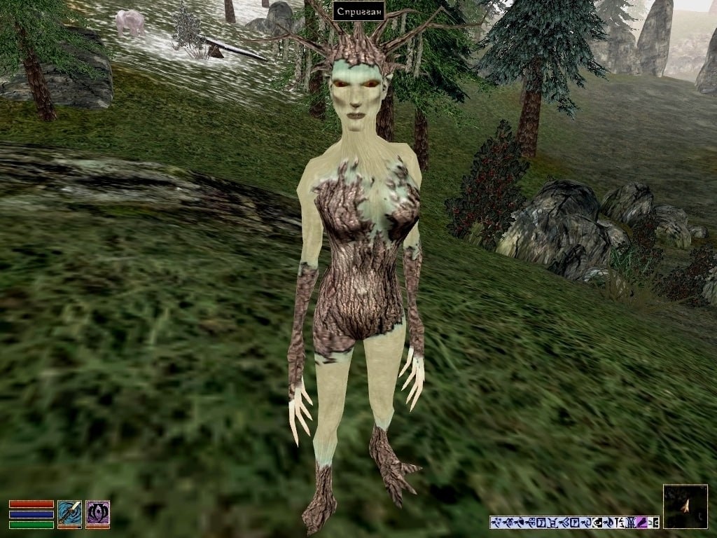 Спригган (Spriggan). По поверьям скаалов, ожившие деревья, защищающие Лес Хирстаанг от непрошеных гостей и огня. В бою способны дважды возрождаться, так что бить их лучше на расстоянии. Spriggan. According to Skaal beliefs, living trees that protect the Hirstaang Forest from intruders and fire. They can respawn twice in battle, so it is better to attack them from a distance. #Bloodmoon