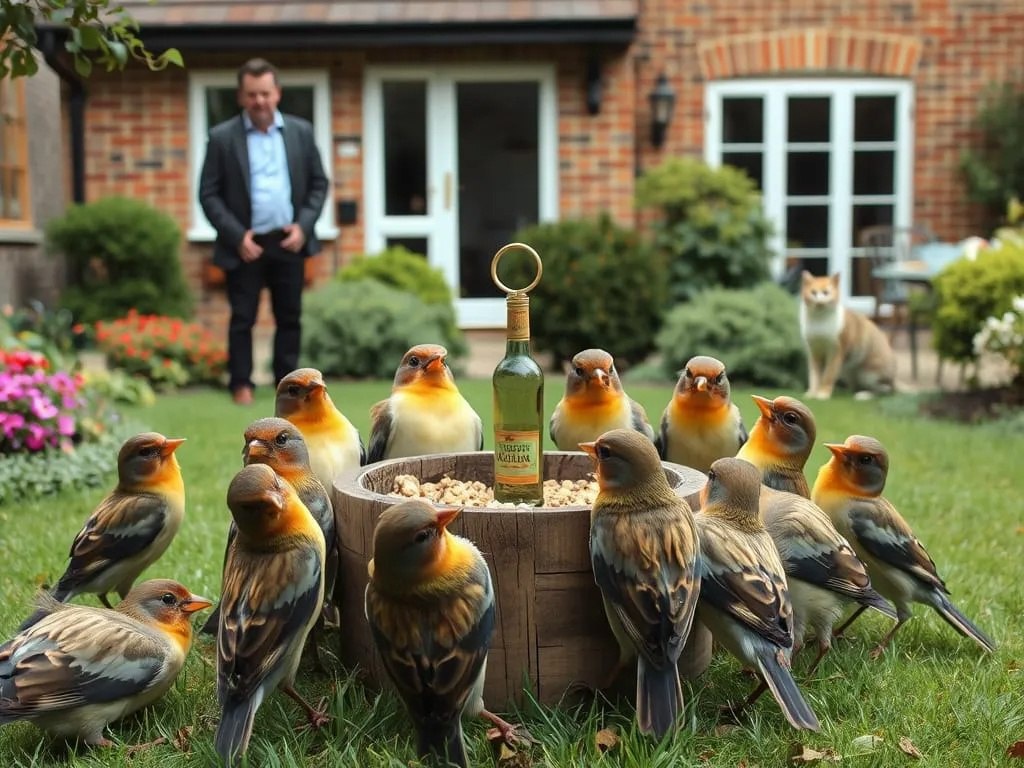 real life characters of A scene takes place in a garden where several birds are drunk after consuming sherry cake crumbs. Gathered around a wooden feeder, the birds adopt unusual postures (some lying on their backs with their feet in the air) and facial expressions that reflect the effects of alcohol. No bottle in the background. In the background, a man and a woman watch the scene with surprise in front of a brick house, while a cat stands nearby. The atmosphere is light and playful, illustrating the unintended consequences of leaving alcoholic cake crumbs within the reach of birds. #neuroart #нейроарт #ai #ии #нейросеть #картинки #искусственныйинтеллект #цифровоеискусство #digitalart #арт #art #prompt #промпт #подсказка