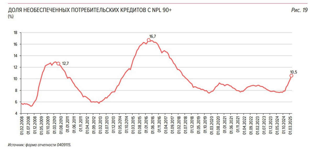 Среди необеспеченных кредитов для населения 10,5% относятся к категории NPL 90+ на конец 1 квартала 2025 года, то есть платежи по ним просрочены на 90 и более дней. На начало октября 2024 года это значение было на уровне 7,9%.