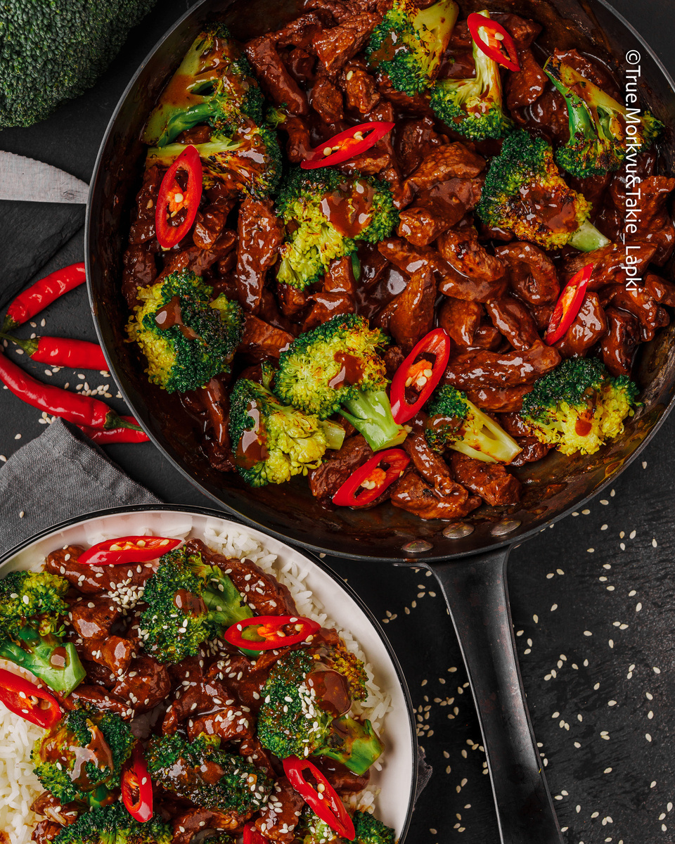 5️⃣ Верните на базу брокколи и мясо, перемешайте, дайте им пожениться пару минут. Разложите по тарелкам, украсьте кунжутом и подавайте.