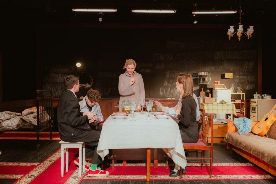 Да, предметный мир — тоже одна из изюминок спектакля. Сценограф Анвар Гумаров создал пространство, в котором натурализма и символизма поровну: локации квартиры в сталинской семиэтажке, лишенные физических границ (буквально как в «Догвилле») выглядят при всём при этом ошеломительно настоящими.