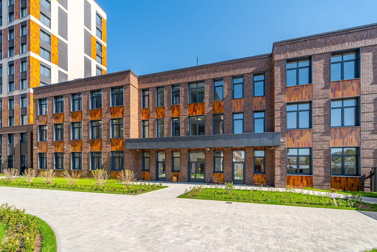 Фасады детского сада оформлены в едином стиле с жилым комплексом – с запоминающимися янтарными акцентами. В садике обустроен современный бассейн, спальни, музыкальный и физкультурный залы, помещения для кружков, медицинский кабинет, кухня.