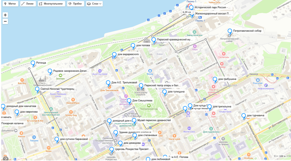 Примерно 6 км. Мимо купеческих особняков. Зайти на пермскую деревянную скульптуру посмотреть. Чашечку кофе по дороге выпить.
