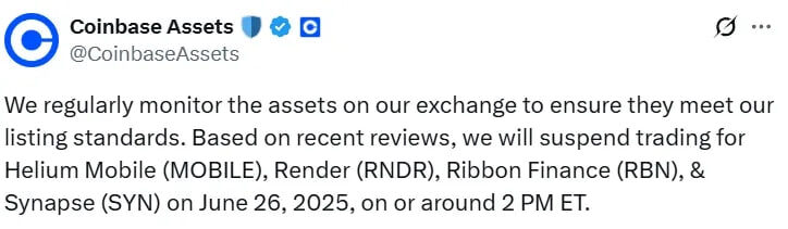 🔸Coinbase приостановила торги Helium Mobile (MOBILE), Render (RNDR), Ribbon Finance (RBN) и Synapse (SYN)