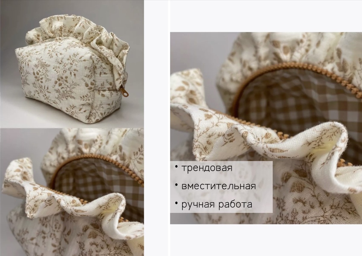 Косметичка очень приятная на ощупь, лёгкая и удобная. Она легко стирается в стиральной машине и сохраняет свой внешний вид. Надёжная фурнитура делает использование косметички комфортным: молния открывается и закрывается без усилий.