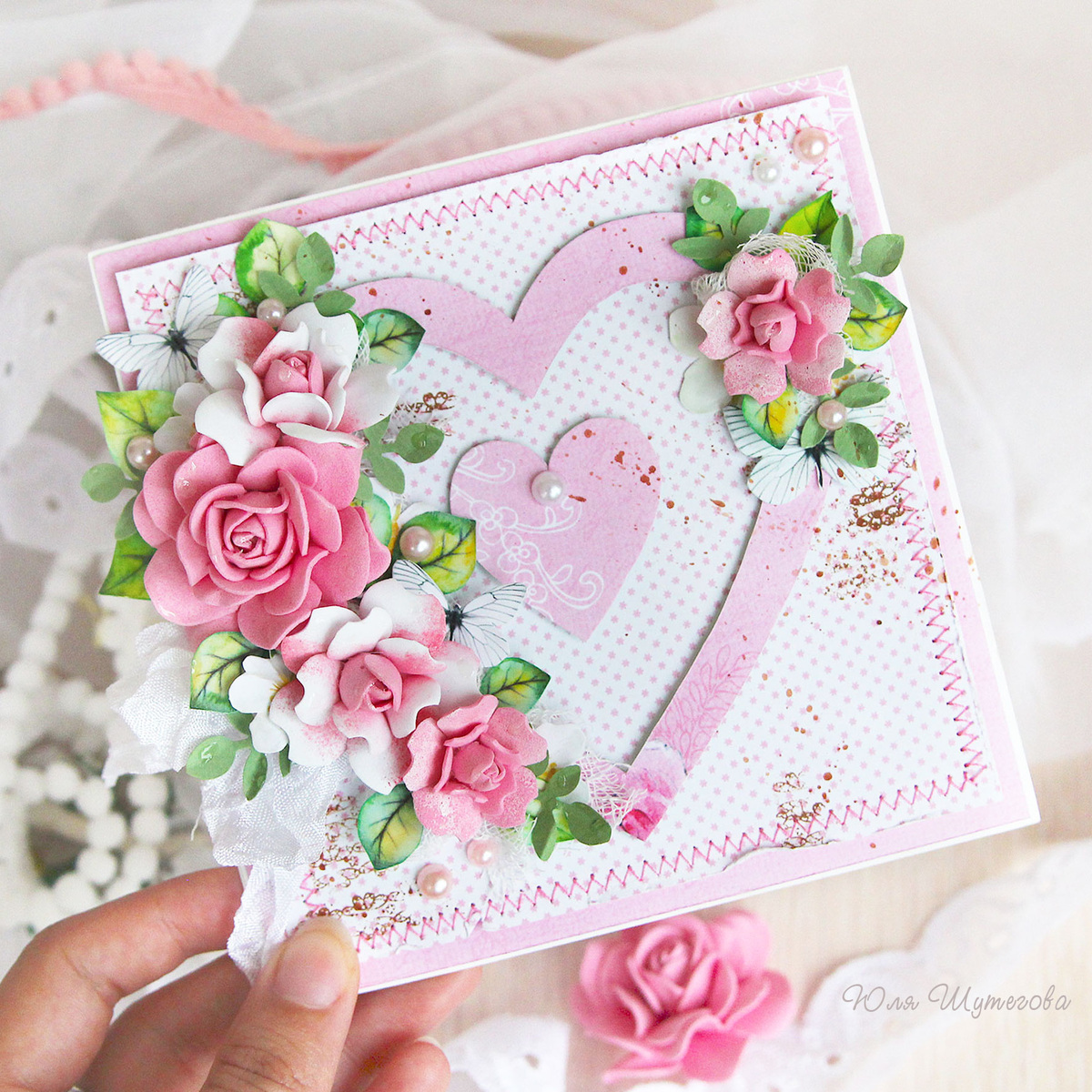 В этой публикации хочу поделиться с вами красотой свадебной открытки. Покажу вдохновляющие фото с деталями и расскажу про их создание. Приятного чтения и просмотра 💕 Чаще всего для свадебных работ выбирают нежные сочетания. Эта открытка не исключение. Для нее я решила использовать такие цвета: нежно-розовый, розовый, зеленый, белый. Открытка квадратной формы. Ее размер 13х13 см. Для основы выбрала белый кардсток (200гр/м2). В качестве подложек выбрала бумагу для скрапбукинга двух разных дизайнов. Самая первая (нижняя) подложка розового цвета с небольшими белыми узорами, а вторая подложка с мелким розовым рисунком на белом фоне. Верхнюю подложку прошила по контуру на машинке, добавила оттиски штампом и нанесла брызги коричневой краски. В центральной части открытки двойное сердечко. Точнее, это два сердечка)) Одно большое в виде контура, а второе маленькое. Оба этих элемента вырезала ножничками из бумаги для скрапбукинга розового цвета с белыми узорами (из такой бумаги сделана и ни