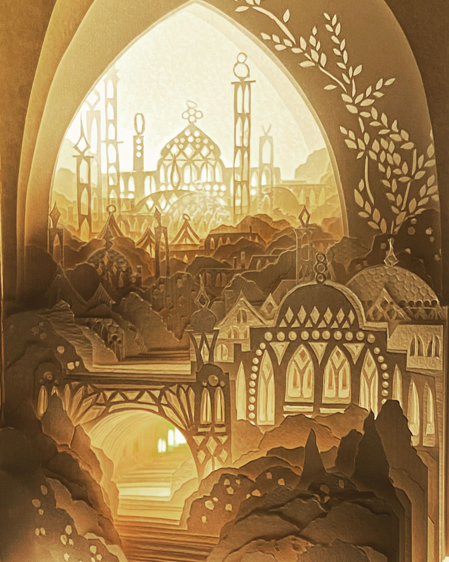 Талантливая японская художница Аюми Сибата создаёт великолепные работы из листов белой бумаги. Её сложные многослойные пейзажи, вдохновлённые красотой природы, а также игрой света и тени, придают работам атмосферность, мечтательность и красоту. Она делает как небольшие композиции, которые помещает в стеклянные сосуды, так и огромные, высотой в несколько метров, инсталляции. Работая в рамках своего культурного кода, Аюми Сибата использует кири-э — традиционное японское искусство резки по бумаге. Идея создавать сложные резные композиции из бумаги пришла Аюми в голову, когда она жила в Нью-Йорке. Большой город сильно давил на неё потоками людей и отсутствием привычного ей спокойствия. Чтобы обрести умиротворение, японка стала регулярно посещать одну из местных церквей, чтобы побыть там в одиночестве, подумать и помолиться. «Однажды в 2010 году я сидела в церкви и смотрела на льющийся через витражное окно свет, — говорит Аюми Сибата. — Внезапно я вспомнила, что в школе использовала чёрную