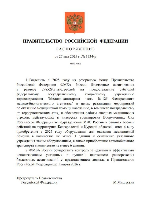 «Решение позволит продолжать оказывать медпомощь военнослужащим и гражданскому населению, обеспечит необходимой техникой и оборудованием сводные медицинские отряды, работающие в районах боевых действий», — говорится в сообщении.