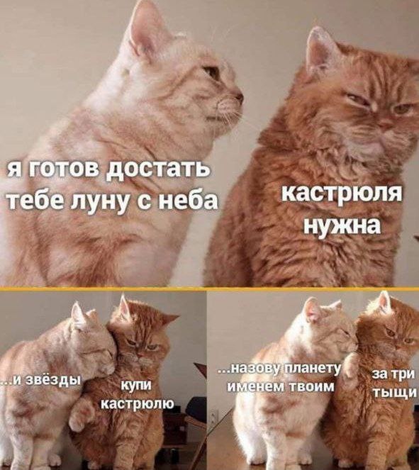 Я тот человек, которому бесполезно говорить о великом. Меня не соблазнят пылкие слова о готовности достать звезду с неба и уверения в моей бесценности. Я уверена — если мужчина кричит о звездах, значит он не видит реальных желаний женщины и ее потребностей. На эту тему была совершенно гениальная сцена в «Тайнах следствия», когда муж жалуется на свою жену и говорит что он для нее то и это, а ее подруга вздыхает и говорит: да ты ей машину стиральную купи! Но до мужа такие простые вещи не доходят, потому что в его идеальном мире любовь это что-то возвышенное, жертвенное, при чем тут стиральная машинка! Похожая ситуация, когда мужчина делает круглые глаза и говорит: какой клининг? ты совсем что ли? И заметьте, он эти круглые глаза делает даже в том случае, если жена сама готова оплатить эти услуги. Потому что это ломает его представления о жизни в целом и обязанностях(!) жены. О, у нас очень хорошо знают об обязанностях жен — спроси, их тут же с жаром перечистят. И женщины, и мужчины