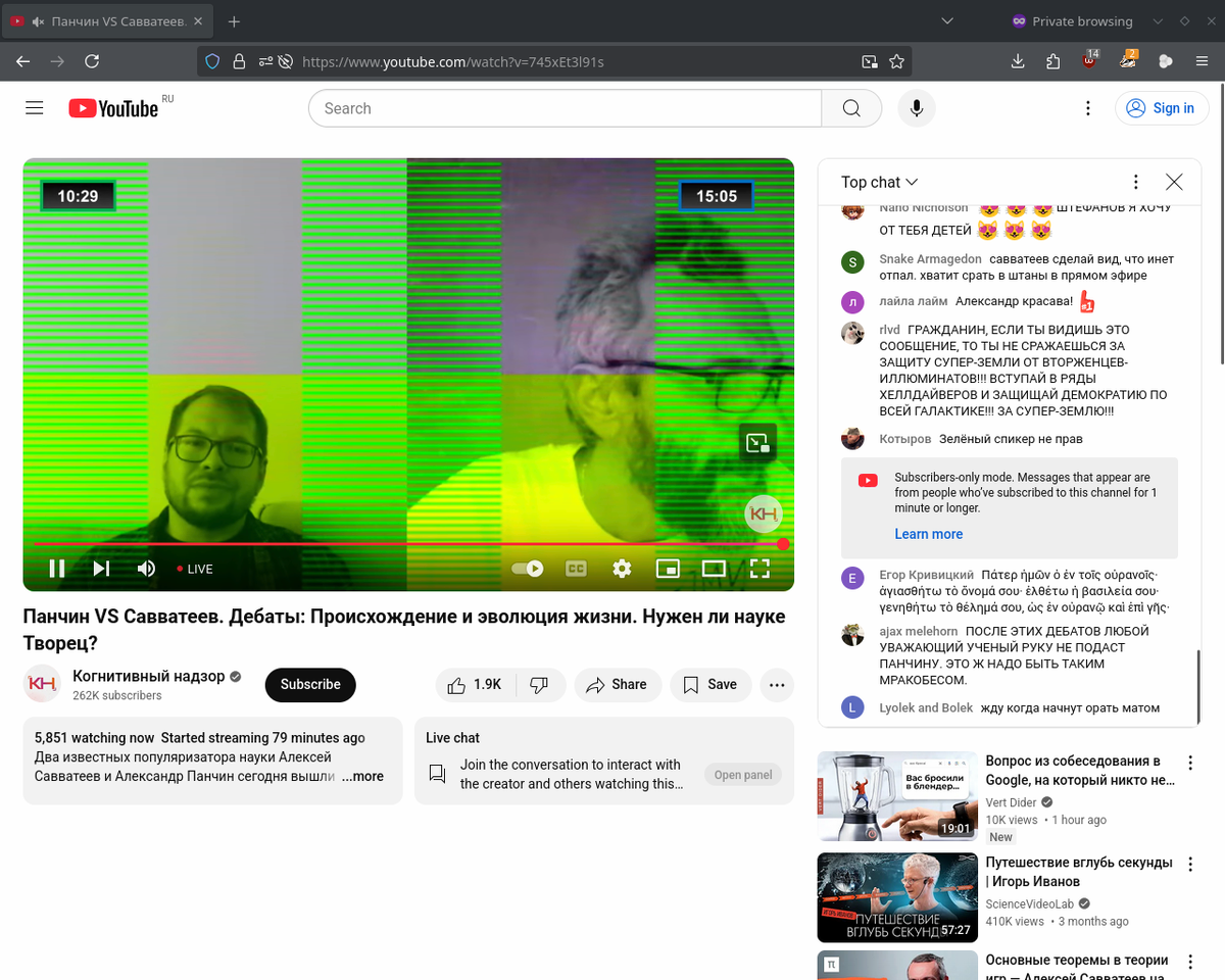 на своём канале Савитцкий открыто сказал что Панчин выступил хуже чем мог бы. мне тоже так показалось, но я подумал это из-за более яркой манеры Саввватева... ну раз друг сказал первым правду в лицо... то да мне тоже так показалось. особенно начало. видимо Панчин хотел выглядеть боле спокойным или были иные причины.