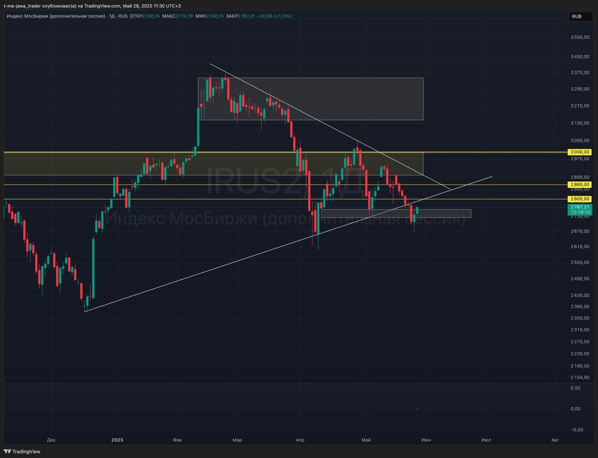 🗓 Ситуация на среду 28 мая 2025: Индекс Мосбиржи 🇷🇺 $IMOEXF $MXM5 $MMM5 показывает отскок от зоны 2670. Рынок был сильно перепродан, еще и новостной фон немного улучшился. В любом случае логично показать отскок в район 2800-2860. Далее непонятно, с одной стороны тренд пока нисходящий и можем пойти еще ниже. С другой стороны, откуп состоялся и мы на более-менее справедливых уровнях, можем войти в боковик в ожидании новостей. Спекулятивно можно попробовать отыграть шорт от уровней сопротивления, но надо быть осторожнее, на новостях может вынести в любую сторону. Обязательно надо ставить стоп. Всем успехов! 👉 Подпишись на Jawa Trader