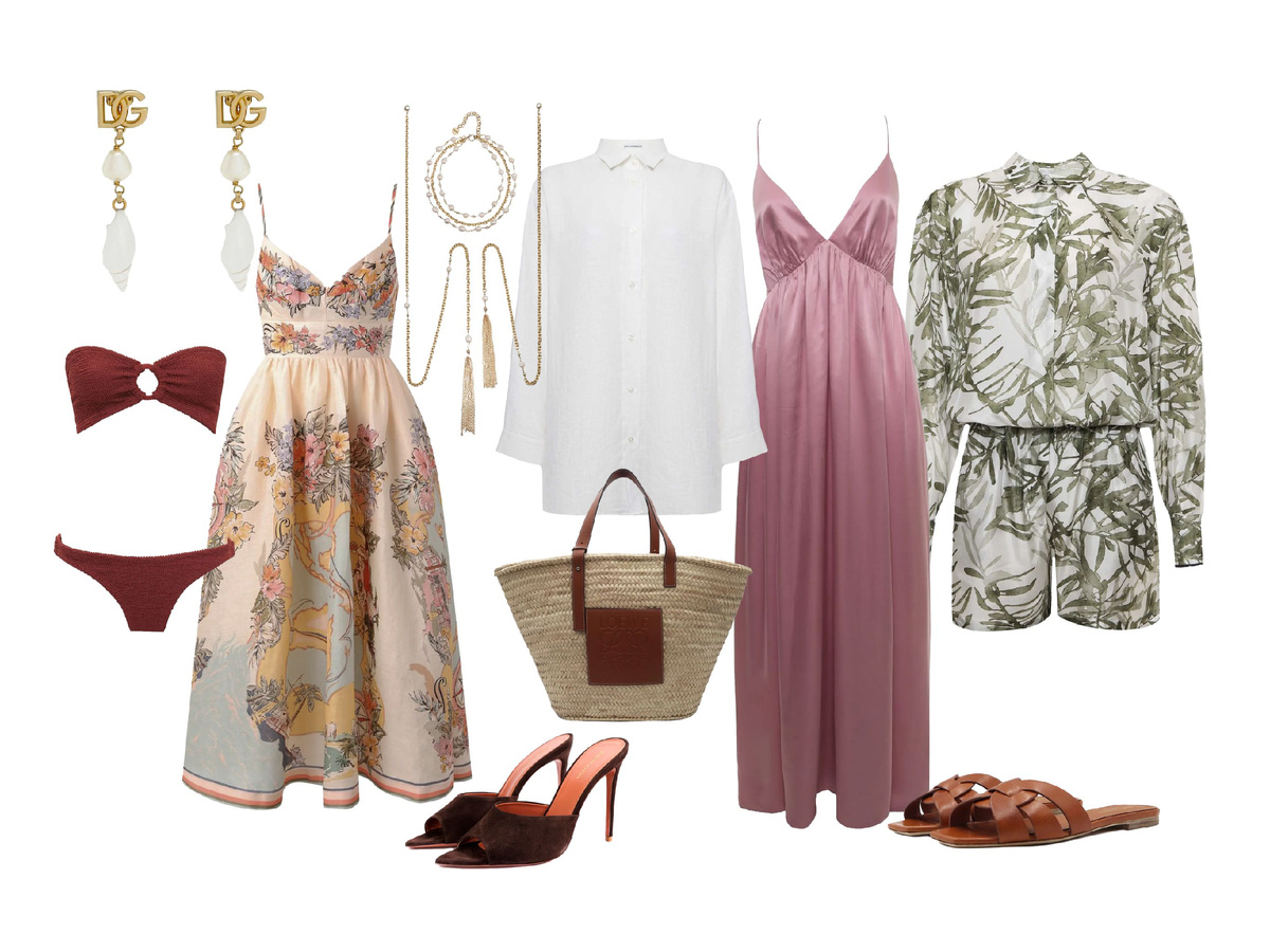 Платье-сарафан, белая рубашка, костюм, купальник, мюли, сумка, платье, колье-трансформер, серьги, шлепанцы