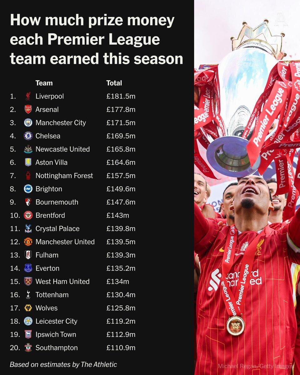 Призовые клубов в этом сезоне Премьер-Лиги. Максимум — 182 миллиона фунтов, минимум — 111 миллионов фунтов 📊