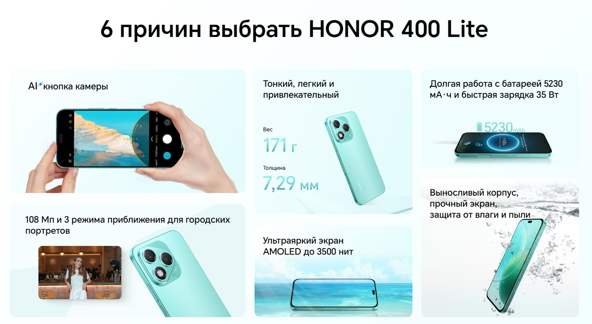В российских магазинах электроники и на маркетплейсах появился новый смартфон HONOR 400 Lite. Новинка привлекает внимание дизайном, специальной кнопкой камеры, ярким экраном и оптимальной производительностью. HONOR 400 Lite — это первый смартфон бренда на базе Android с AI‑кнопкой, которая отвечает за быстрый запуск камеры и доступ к «Google Объективу» для распознавания объектов с помощью искусственного интеллекта. Нажатие в течение одной секунды мгновенно запускает камеру, повторное нажатие позволяет сделать снимок, удержание кнопки — записать видео. В профессиональном режиме доступны расширенные функции управления камерой: короткое нажатие для смены точки фокусировки и проведение пальцем для зума. Длительное удержание AI-кнопки открывает приложение «Google Объектив», которое помогает узнавать названия растений, животных и произведений искусства, мгновенно переводить тексты более чем на 100 языков, решать математические задачи или находить товары по фотографии. HONOR 400 Lite оснащен