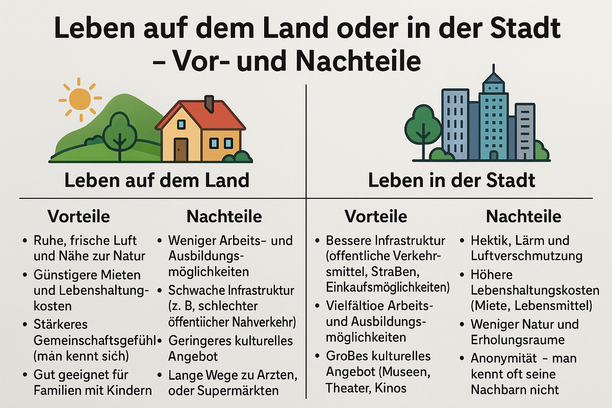 Π’Π΅ΠΌΠ°: ΠΠΈΠ·Π½Ρ Π² Π΄Π΅ΡΠ΅Π²Π½Π΅ ΠΈΠ»ΠΈ Π² Π³ΠΎΡΠΎΠ΄Π΅? ΠΠ»ΡΡΡ ΠΈ ΠΌΠΈΠ½ΡΡΡ. Thema: Leben auf dem Lande oder in der Stadt?. Vor- und Nachteile. β