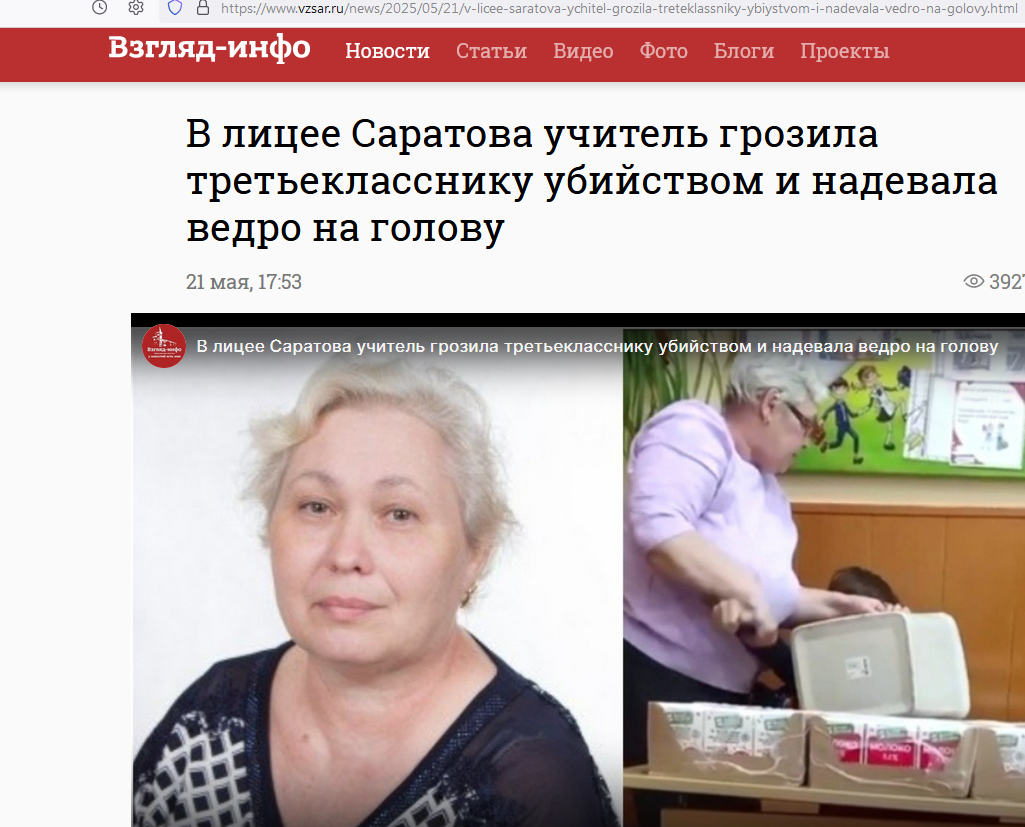 В саратовском лицее № 3 имени Пушкина учительница начальных классов Елена Панкратова угрожала школьнику 3-го класса убийством, затем надела ему на голову мусорное ведро, а потом свалила в это ведро личные вещи мальчика.