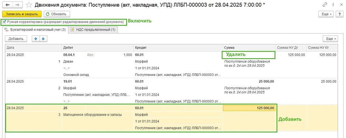 Как отразить покупку ОС, которое стоит более 100 000 рублей, но в бухучете признается малоценным 🤔 Не всегда все ситуации автоматизированы в 1С. Вот один из таких кейсов, где пришлось прибегнуть к ручным корректировкам ✍️ В учетной политике организации по бухучету лимит по основным средствами более 100 тыс. руб. (200 тыс.) и возникает ситуация, когда при покупке ОС за 150 тыс. в бухучете оно к ОС не относится, а в налоговом учете это ОС, так как стоимость более 100 тыс. 🔧В таком случае после проведения документа Поступление оборудования проводки корректируются вручную следующим образом: 1️⃣В первой проводке очищаем сумму в БУ, чтобы на счете 08.04.1 осталась только сумма по НУ 2️⃣Делаем дополнительную проводку как если бы мы покупали малоценное оборудование: Дт 26 Кт 60.01 и сумму указываем только в БУ И при закрытии месяца после принятия ОС к учету произойдет расчет амортизации только в НУ 📅