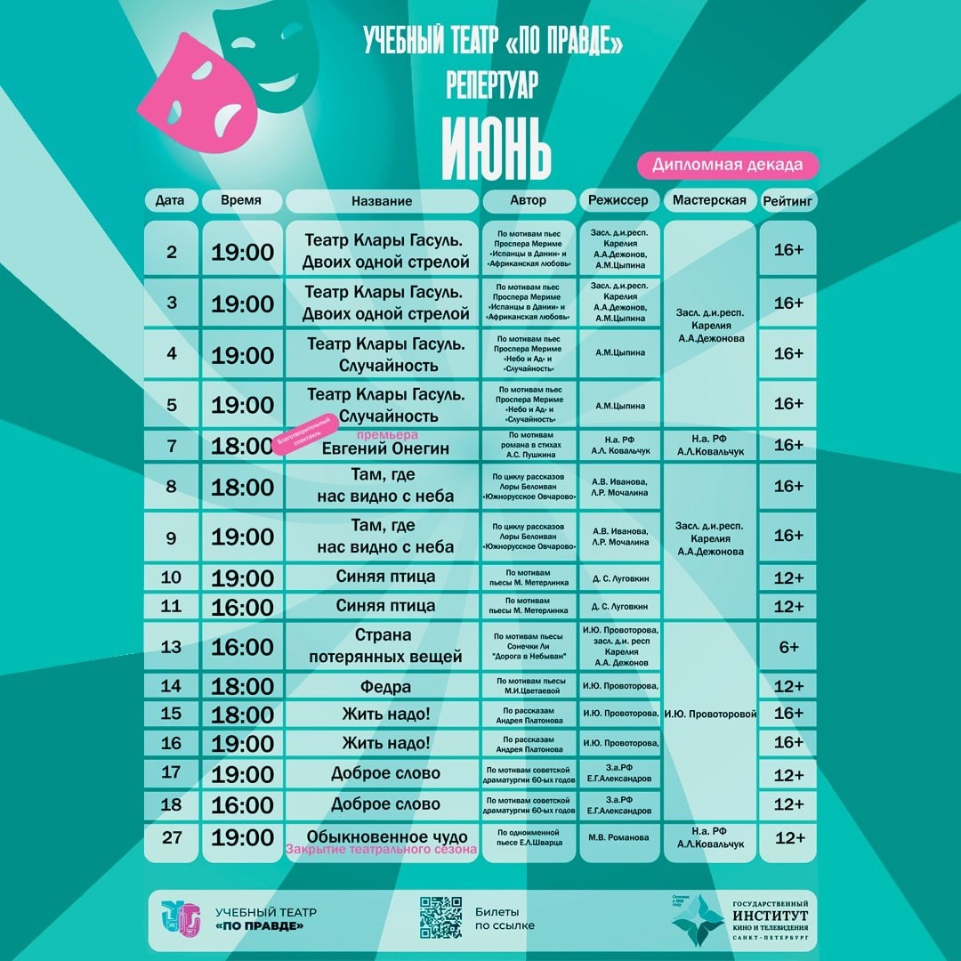 РЕПЕРТУАР Учебного театра на ИЮНЬ! 🎭 Учебный театр встречает лето яркими премьерами и любимыми постановками! 📌«Театр Клары Гасудь. Двоих одной стрелой» 16+, мастерская Андрея Дежонова 2 июня в 19:00 🎟 https://info.gikit.ru/afisha/teatrklarigasuldvoihodnoistreloi 📌«Театр Клары Гасудь. Двоих одной стрелой» 16+, мастерская Андрея Дежонова 3 июня в 19:00 🎟 https://info.gikit.ru/afisha/teatrklarigasuldvoihodnoistreloi 📌«Театр Клары Гасудь. Случайность» 16+, мастерская Андрея Дежонова 4 июня в 19:00 🎟 https://info.gikit.ru/afisha/teatrklarigasulsluchinost 📌«Театр Клары Гасудь. Случайность» 16+, мастерская Андрея Дежонова 5 июня в 19:00 🎟 https://info.gikit.ru/afisha/teatrklarigasulsluchinost 📌«Евгений Онегин» 16+, мастерская Анны Ковальчук, ПРЕМЬЕРА 7 июня в 18:00 🎟 https://info.gikit.ru/afisha/evgeniyonegin 📌«Там, где нас видно с неба» 16+, мастерская Андрея Дежонова 8 июня в 18:00 🎟 https://info.gikit.ru/afisha/tamgdenasnevidnosneba 📌«Там, где нас видно с неба» 16+, м