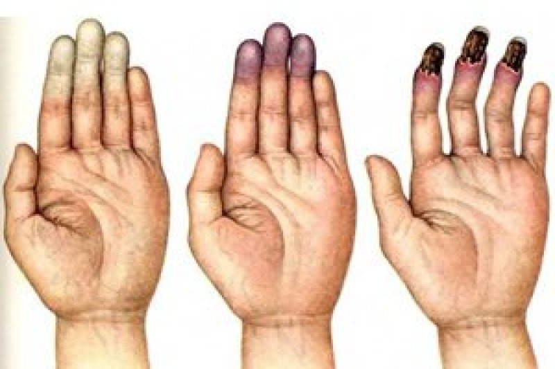 Гиперемическая фаза (красные пальцы) – реактивная вазодилатация.