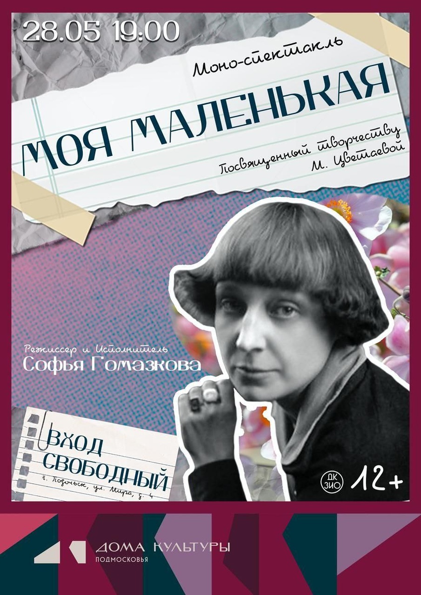 ✨ Моноспектакль «Моя маленькая» — диалог с Цветаевой. 🎭 Студентка МГИК Софья Гомазкова представит авторскую постановку, посвященную судьбе и творчеству Марины Цветаевой. 📚 Через лирику, дневниковые записи и письма зрители погрузятся во внутренний мир поэтессы: ее страхи, любовь, одиночество и непоколебимую веру в слово. 🌸 Для тех, кто готов к искреннему разговору с поэзией. 🚫 Возраст: 14+ 📆 28.05.2025 🕒 19:00 🏢 ДК ЗИО 📍 г. Подольск, ул. Мира, 4 💰 Вход свободный❗️ #webПодольск ⭐Разместить публикацию ⭐Поддержать канал голосом ✅ Мероприятия Подольск https://dzen.ru/id/66ed500f7b5671493eca3fd6 http://vk.com/podolsk_events http://dzen.ru/podolsk_events