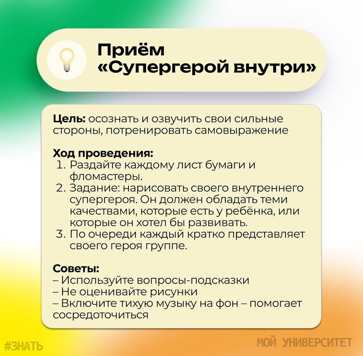 #ЗНАТЬ 🫂«Давайте знакомиться»: как превратить первое знакомство в лагере в урок по самопрезентации Первый день в лагере задаёт атмосферу всей смене. Можно посадить подопечных в круг, сказать: «Давайте познакомимся» — и в ответ получить неловкую тишину или цепочку формальных фраз. А можно сделать по-другому. Запустить игру — и заодно прокачать у ребят умение говорить о себе и презентовать себя. В карточках мы собрали 6 приёмов, которые работают. Проверено. Можно брать и для школы, и для лагеря. ❤️ Хотите, чтобы дети включались, говорили, думали и работали вместе — а не просто слушали? Активные методы обучения (АМО) как раз про это. У нас есть целая серия курсов по АМО — для воспитателей, учителей, вожатых и педагогов-предметников. Всё по возрастам и уровням. Если вам близок такой подход — можно подобрать курс, который подойдёт именно вам: Выбрать свой курс АМО → Подписаться на «Мой университет» 🎓🤓