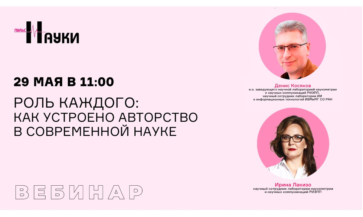 29 мая в 11:00 (Мск) компания «Пульс науки» проводит вебинар «Роль каждого: как устроено авторство в современной науке». Научное авторство перестало быть индивидуальным подвигом: большинство исследований сегодня – результат коллективной работы. Научные коллаборации становятся всё более масштабными, большие и очень большие авторские коллективы – давно не редкость, а распределение ролей в них всё сложнее. Вебинар посвящён вопросам современного понимания авторства в науке и учёта индивидуального вклада в коллективные исследования. Мы рассмотрим, как исторически изменялось значение порядка авторов в публикации и какие нормы действуют сегодня в разных дисциплинах и национальных культурах. Приглашенные эксперты: — Денис Косяков, и.о. заведующего научной лабораторией наукометрии и научных коммуникаций РИЭПП, научный сотрудник лаборатории ИИ и информационных технологий ИВМиМГ СО РАН. — Ирина Лакизо, научный сотрудник лаборатории наукометрии и научных коммуникаций РИЭПП. На вебинар планируется: