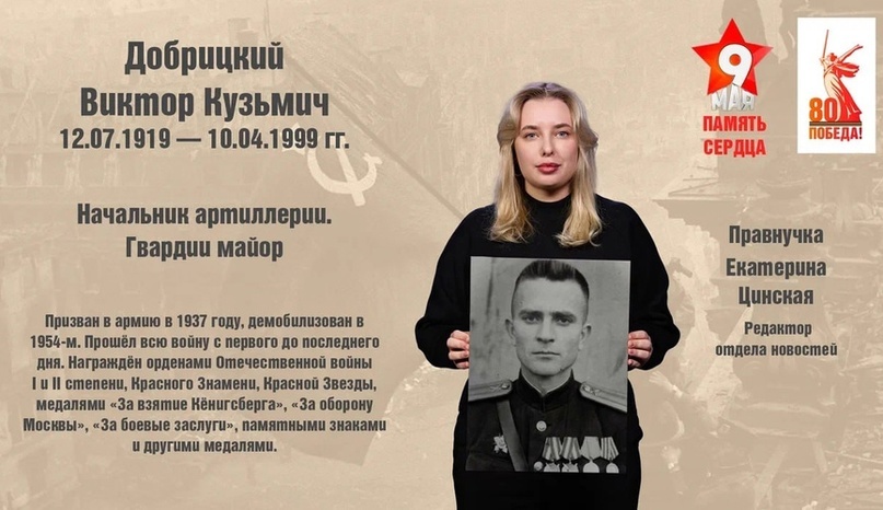 Почти каждая семья в бывшем СССР хранит память о своих героях – тех, кто воевал и приблизил Победу в Великой Отечественной войне. Проект «Наша память сердца» собрал истории о подвигах родных и близких сотрудников Межгосударственной телерадиокомпании «Мир». В год 80-летия Победы MIR24.TV продолжает рассказ о наших героях. На фронтах Великой Отечественной войны сражался за победу над немецко-фашистскими захватчиками артиллерист, гвардии майор Виктор Кузьмич Добрицкий – прадедушка редактора отдела новостей дирекции трансмедийных проектов МТРК «Мир» Екатерины Цинской. «Мой прадедушка Виктор Кузьмич Добрицкий родился 12 июля 1919 года в Краснодаре, в семье рабочих. После окончания школы в 1936 году он поступил в Первое Московское минометно-артиллерйское военное училище им. Красина. И с этого момента стал военнослужащим. Училище он окончил перед самой войной, поэтому с первых же дней попал на фронт. Начал войну командиром батареи под Москвой, окончил ее в апреле 1945 года в Кенигсберге, в д