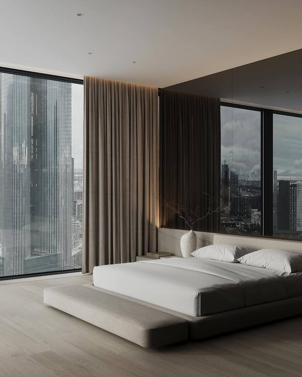 Мастер-блок проекта Capital Towers. В спальню можно попасть через гардеробную с закрытым хранением, в которой мы разместили подвесную лавку у окна. Стену за изголовьем оформили чёрным стеклом. Таким образом мы добавили объёма и раздвинули границы помещения - практически удвоили шикарную панораму. Панель за кроватью и тумбы выполнены в облицовке керамогранитом в цвет ткани. Этим приёмом объединяем их с полом и рисуем горизонталь. Минимализм в цветах, отделке и декоре. Только лаконичность и актуальность приёмов.🙌 — Project: #pr_capital Year: 2025 Location: Moscow — +79037959696 Info@wowroom.ru #wowroomdesign —