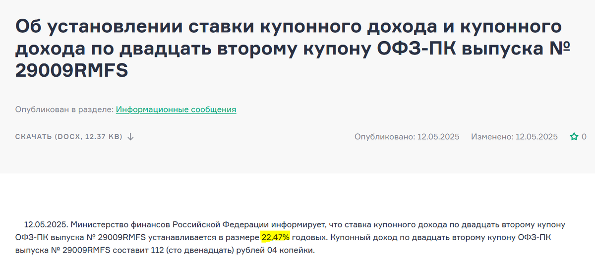 Несколько недель назад я приводил расчет нового, 22-го, купона старосхемной облигации ОФЗ ПК 29009. действие которого началось, 16 мая 2025 года. У меня выходила его величина 22.49%. На самом деле объявили 22.47% - погрешность минимальная. Кстати, ВТБ почему-то перестал отображать текущий купон в своем приложении. Нас же больше интересует вопрос: Я ориентировался на поведение предыдущего выпуска, 29008, и говорил о росте на 0.5%. На самом деле облигация выросла почти на 1%. Со 103.98% две недели назад до текущих 105% Такая динамика ОФЗ 29009 помогает спрогнозировать поведение выпуска 29010, купон которого объявят чуть менее через месяц, 16 июня 2025. Сейчас сложилась уникальная ситуация, когда цены выпусков 29009 и 29010 практически совпадают. Исторически и по всем параметрам доходности более старший выпуск старосхемной ОФЗ ПК, в данном случае 29010, должен торговаться на 0.6-1% дороже, чем более младший выпуск, 29009. Если ничего не случиться с общим геополитическим или финансовом ф
