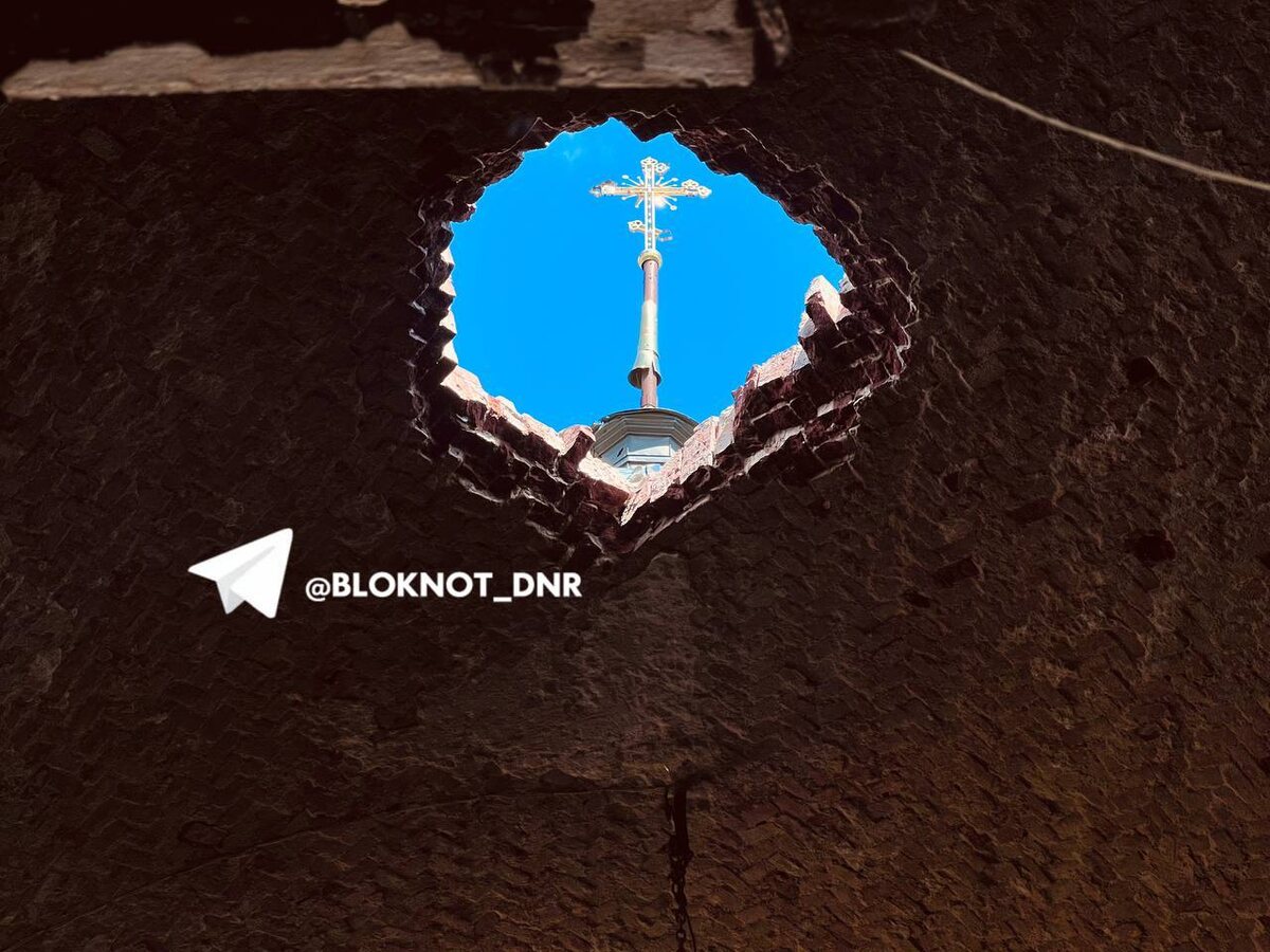 При входе в храм Святителя Николая в селе Никольское в ДНР. Этот храм в свое время не дал разрушить старец Зосима. Сейчас храм сильно пострадал от обстрелов ВСУ, но его можно восстановить. Фото сделано редактором «Блокнот Донецк» Светланой Лариной.