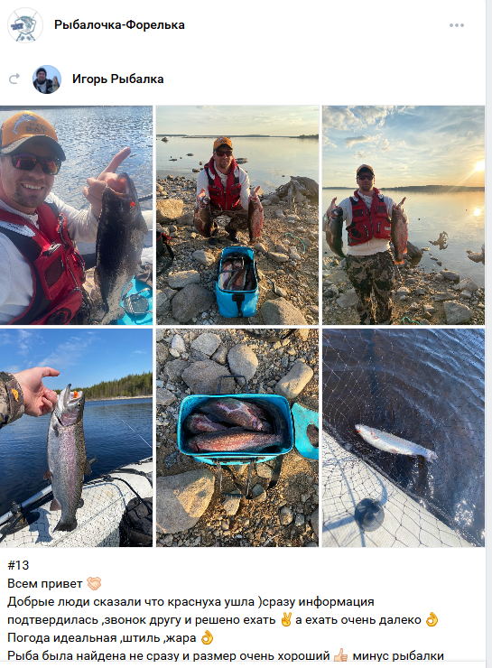 По информации от местных форель ушла при попытке переместить садки. Об этом моментально узнали рыбаки со всей округи Карелии и озеро тут же заполнилось сотнями лодок страждущих халявы. Очень быстро вести долетели и до Питера, откуда, побросав все свои дела, тоже пулей выехали некоторые рыбаки. Как обычно в первые дни уловы были хорошие, но все молчали, слово нашли это место своим трудом за несколько лет, а не получили день назад эту информацию от сарафанного радио. Затем ажиотаж чуть спал и рыбаки начали постепенно выкладывать отчёты. Сколько тонн форели ушло на этот раз неизвестно, но ловят её по сей день. Да, рыба частично разбрелась по озеру и её стаи необходимо поискать. Но долавливать эту беглянку будут ещё долго, озеро огромное и ей есть где спрятаться. К тому же на данном озере это далеко не первый побег, тут и до этого случая часто попадалась радужная форель, оставшаяся с прошлых побегов. Кого интересуют название этого озера, а также свежие отчёты с него, то заходите в мой Тел