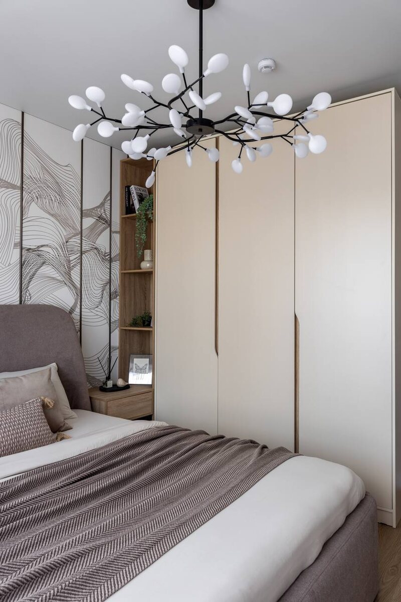 Шкаф Во многих новостройках маленькие спальни, и в них есть такая проблема - очень мало места между шкафом и кроватью. В последнем проекте удалось тютелька в тютельку решить эту зону. Писала тут. Некоторые ставят открытый стеллаж. А тут увидела такое решение у Ольги Мирзабаевой, когда полка открытого стеллажа переходит в тумбочку. Как вам?