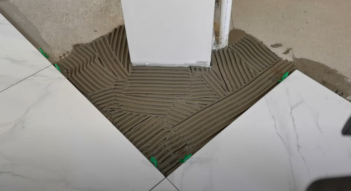 Рекомендация: “Наносите клей небольшими участками, чтобы он не успел высохнуть до укладки плитки.”