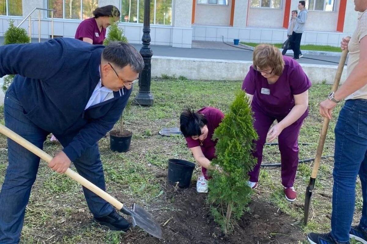 🔹К масштабной акции подключились и представители власти. Депутат Законодательного Собрания Сергей Бабин, депутат городского Совета Юрий Кириенко вместе с работниками детской поликлиники на проспекте Братьев Коростелевых высадили перед учреждением 1500 корней цветов и туи.