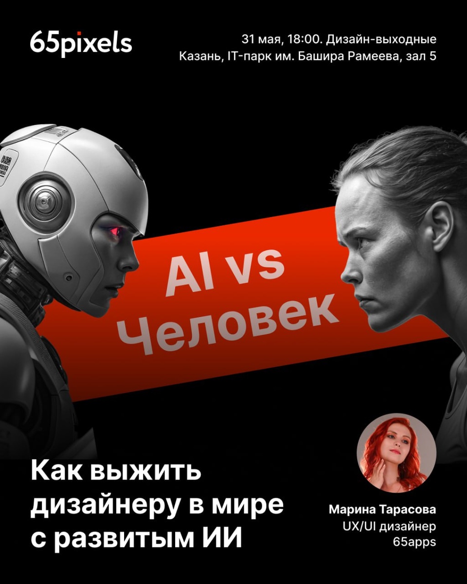 Как сейчас выглядит противостояние между человеком и нейросетями? Будет ли место для человека в мире с развитыми AI? Как не упустить тренды и адаптироваться к меняющемуся миру? На эти вопросы будет отвечать UX/UI-дизайнер 65apps Марина Тарасова на очередных Дизайн-выходных! Все подробности — на карточке! Увидимся!