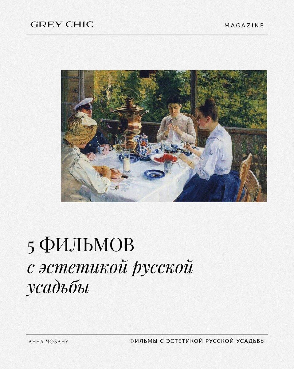 Мы настолько вдохновились темой майской встречи Клуба Эстетов и презентацией «Усадебной коллекции» бренда Kiriclan, что решили обратиться к Анне Чобану, которая прочитала увлекательную лекцию о русской усадьбе. Анна подготовила список фильмов, чтобы окунуться в загородную эстетику: Даже если в ближайшее время вы не планируете брать отпуск, фильмы помогут украсить вечер и погрузят в атмосферу чаепития на веранде. Приятного просмотра 🧡 GREY CHIC
