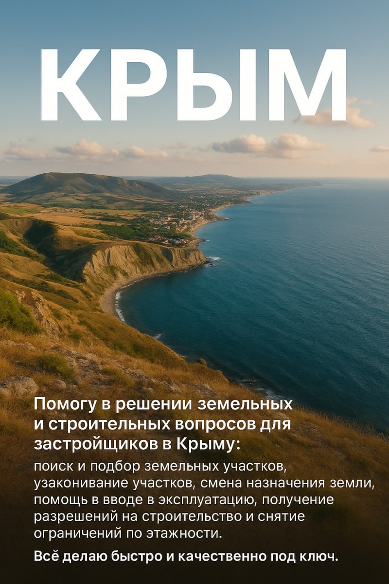 ⭐️ РЕШУ ЛЮБОЙ ЗЕМЕЛЬНЫЙ и СТРОИТЕЛЬНЫЙ ВОПРОС В КРЫМУ 🤙 Решаю все земельные и строительные вопросы для застройщиков — от поиска участка до ввода в эксплуатацию. ❓ ЧТО МЫ ДЕЛАЕМ: 1. ▶️ Ищем и подбираем землю под ваши требования (локация, площадь, инфраструктура). 2. 📄 Узакониваем участки, включая «проблемные» объекты. 3. 🔄 Меняем ВРИ (перевод земель в нужную категорию: ИЖС, коммерция, многоэтажка). 4. 🏗 Получаем разрешения на строительство и снимаем ограничения по этажности, обходя местные сложности. 5. ✅ Вводим объекты в эксплуатацию без лишних нервов. ❓ ПОЧЕМУ ВЫБИРАЮТ НАС: ✅Скорость: Сроки на 40% быстрее рынка. ✅ Качество: 100% успешных кейсов за 2024 год. ✅ Работаем на вас и в ваших интересах: Мы сопровождаем проект до самого конца. ✅ Прозрачность: Открыто говорим о всех тратах на начальном этапе, без скрытых платежей. ➕ ВАШИ ПРЕИМУЩЕСТВА: ✅Экономия до 1,5 лет на согласованиях. ✅Защита от рисков: Проверяем участки на обременения еще до покупки. ✅Легализация «серых» объектов