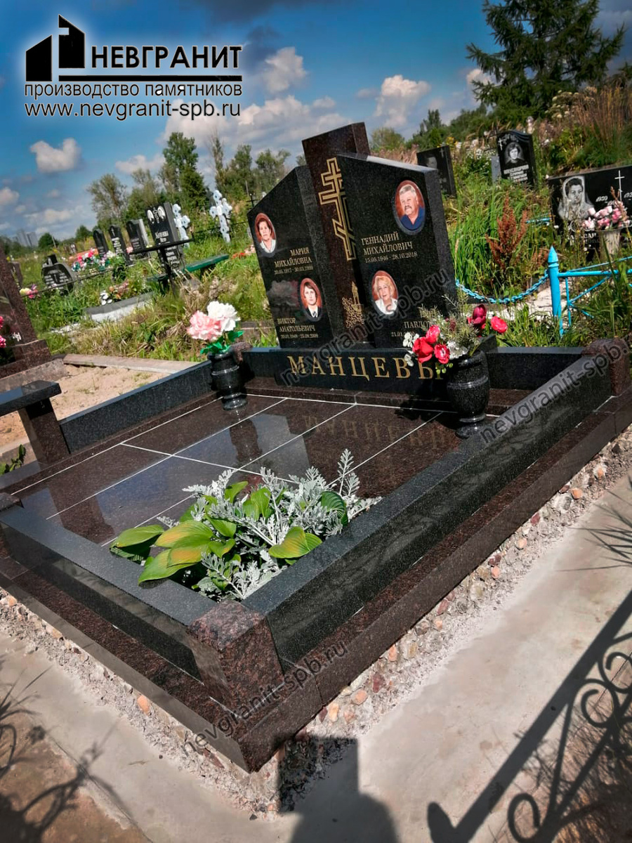 Этот памятник является образцом изысканного и тщательно продуманного мемориального оформления, выполненного из высококачественного гранита. Он предназначен для захоронения нескольких членов семьи, что подчеркивается общей фамилией, выгравированной на основании памятника. Конструкция памятника включает в себя два вертикальных стелы, которые расположены под небольшим углом друг к другу, создавая эффект динамичности и символизируя единство семьи даже после ухода из жизни. На каждой из стел размещены портреты и имена усопших, выполненные с использованием современных технологий гравировки и керамики, что придает памятнику индивидуальность и персонализацию. Особое внимание уделено деталям: на одной из стел изображен православный крест, что говорит о религиозных взглядах и традициях семьи. Основание памятника и ограждение выполнены из того же материала, что создает гармоничный и завершенный вид всей композиции. Внутри ограждения расположен небольшой цветник с зелеными растениями, который д