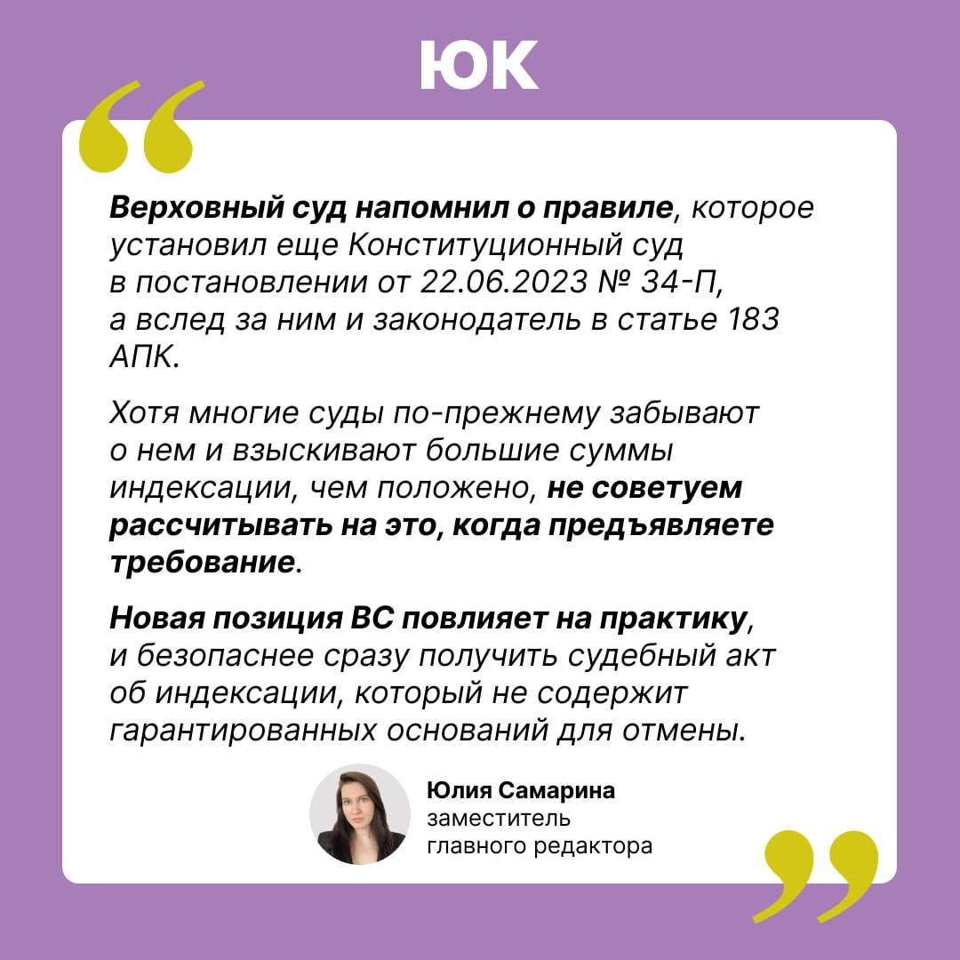 Индексировать бюджетный долг следует по особым правилам Верховный суд напомнил о том, как работает механизм индексации, если должник — госорган, а исполнительный лист предъявляется не приставам, а по правилам Бюджетного кодекса сразу в бюджетное учреждение. Верховный суд отменил акты трех инстанций, которые удовлетворили заявление взыскателя и проиндексировали долг с даты резолютивной части решения по дату его исполнения. Поскольку долг взыскивается с участника бюджетного процесса, это общее правило не действует. В этом случае период индексации нужно отсчитывать с того дня, когда исполнительный лист или судебный приказ поступил на исполнение, а не с даты решения. ⏩️ Тот факт, что госорган неоднократно не получал корреспонденцию, на правила расчета суммы индексации не влияет (определение ВС от 23.05.2025 по делу № А41-94839/2022). Мнение редакции смотрите в карточке. 👆 О других знаковых позициях Верховного суда читайте в статье «Новый Обзор ВС. Главное для инхаус-юриста». Подпис